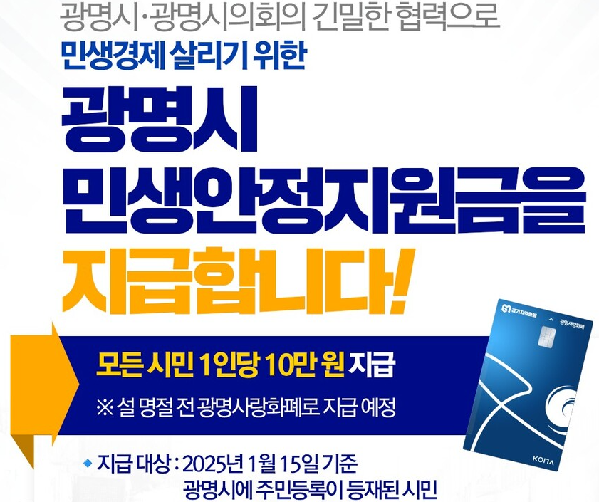 광명시는 모든 시민에게 1인당 10만 원씩 지원금을 지급하기로 결정했습니다. 이 금액은 생활 필수품 구매나 지역 내 소규모 소비를 돕기에 적합하도록 책정되었습니다.