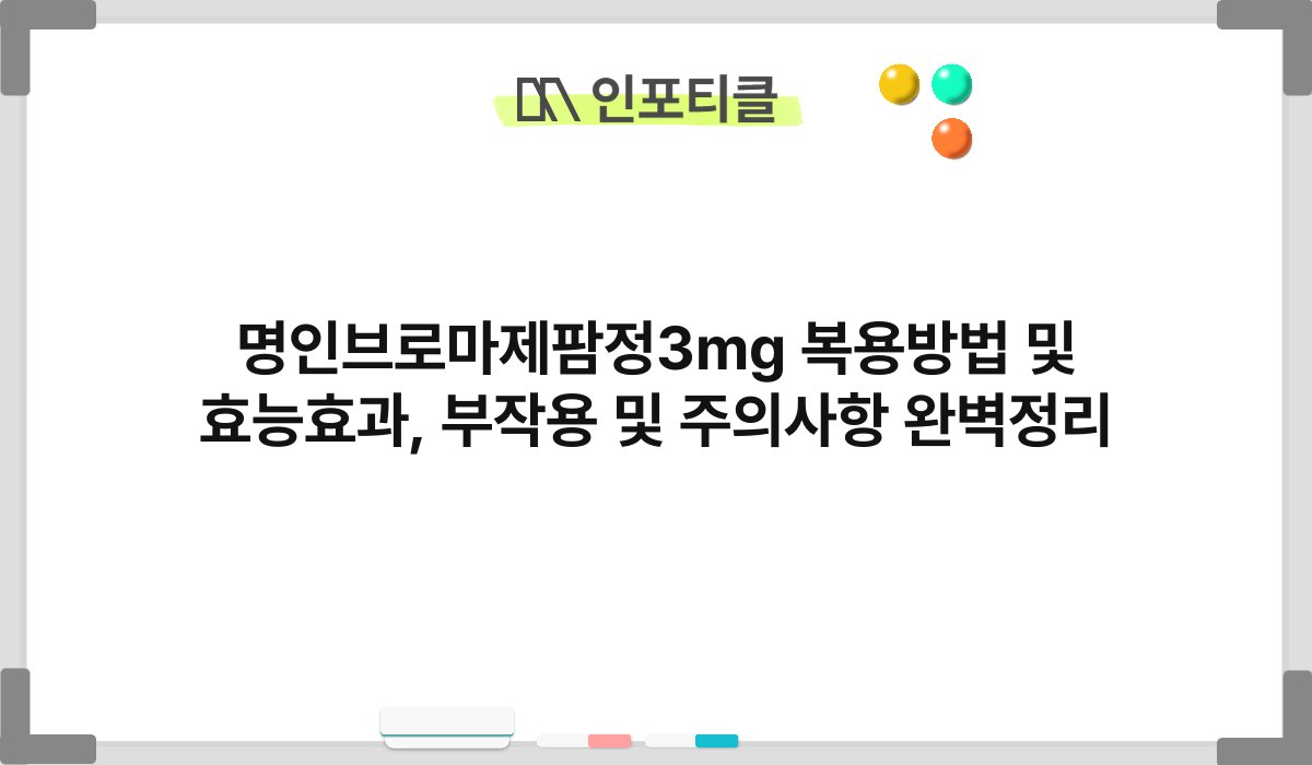 명인브로마제팜정 3mg, 많은 분들이 들어보셨을 텐데요. 하지만 이 약물이 어떤 효능과 효과를 가지고 있는지, 복용 방법과 부작용은 무엇인지 궁금하신 분들이 많습니다. 특히, 이 약물을 사용해야 하는 이유와 주의사항에 대해 잘 알고 계시는 것이 중요합니다. 오늘은 명인브로마제팜정에 대한 모든 정보를 정리해 드리겠습니다. 끝까지 읽으시면 많은 도움이 될 거예요.