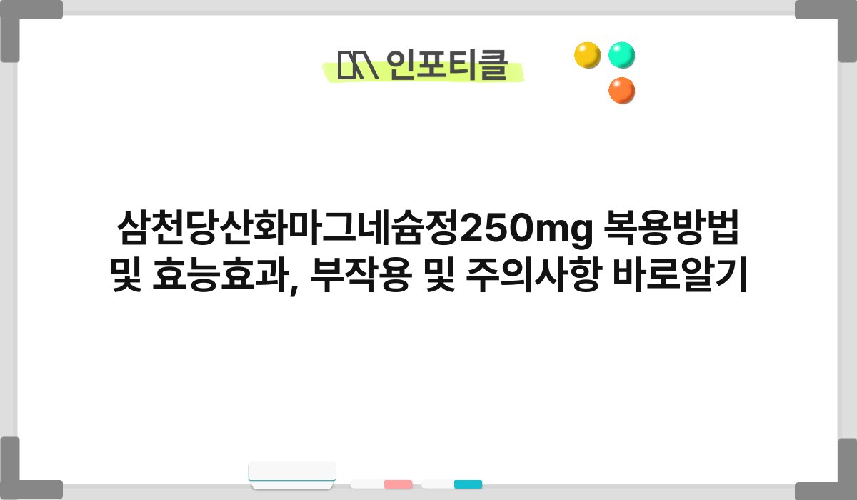 삼천당산화마그네슘정 250mg, 들어보신 적 있으신가요? 이 약물은 많은 분들이 경험하는 배변 문제를 해결하는 데 도움을 줄 수 있습니다. 하지만 복용 방법과 효능뿐만 아니라 부작용도 함께 알아보는 것이 중요합니다. 오늘은 삼천당산화마그네슘정의 복용방법 및 효능효과, 부작용 및 주의사항을 자세히 살펴보도록 하겠습니다. 이해가 쉽게 정리해드릴 테니 끝까지 함께 해주세요!