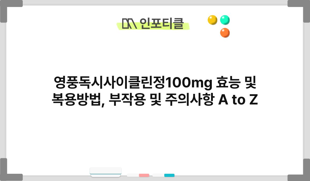 영풍독시사이클린정 100mg, 들어보셨나요? 이 약물은 다양한 감염성 질환 치료에 사용되는 항생제입니다. 하지만 효능이나 복용 방법, 부작용에 대한 정보는 쉽게 접하기 어렵죠. 오늘은 영풍독시사이클린정의 효능과 복용 방법을 비롯해 부작용 및 주의사항까지 A to Z로 알아보겠습니다. 이 글을 통해 이 약물에 대한 이해를 높이고, 안전하게 사용하실 수 있도록 도와드릴게요!